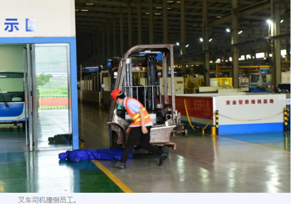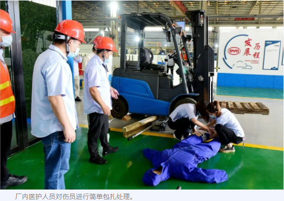 別擔心!這是韶關市比亞迪實業有限公司正在開展叉車應急救援演練活動,現場模擬一名叉車司機在駕駛叉車時違章操作,導致一名員工被撞倒,隨后立即啟動公司救援預案采取的一系列措施的情境。