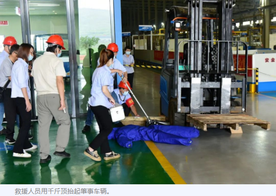 應急救援人員**時間疏通道路并拉好警戒線保護“事故”現場,防止救援過程中發生意外對人員造成二次傷害。在調動另一臺叉車轉移肇事叉車上的物料后,救援人員用千斤頂在兩旁支起肇事叉車,小心、快速地將受傷人員移出危險區域。